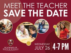 Please mark your calendars for our Meet the Teacher Night on Wednesday, July 26th! More details to come over the summer.